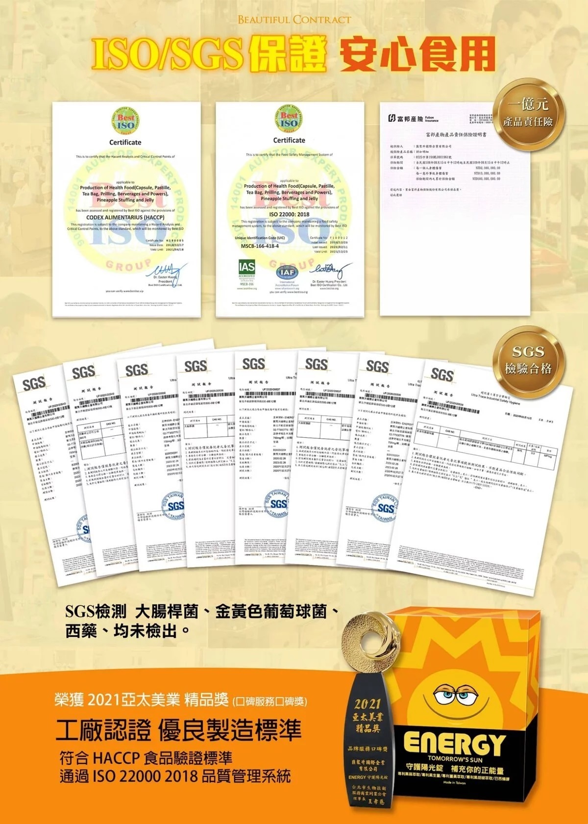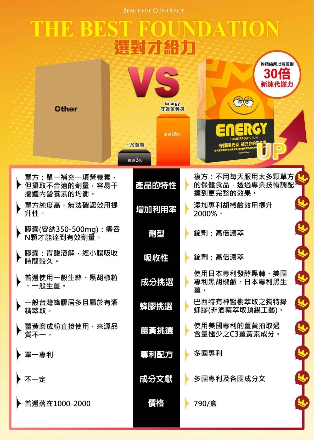 ENERGY 守護陽光錠透過多種專利成分的協同作用,能有效增強免疫力、促進消化健康並提升整體能量水平。這些成分不僅提供抗氧化和抗炎的益處,還能幫助改善身體的活力和抵抗力,適合希望增強健康和提升生活品質的消費者。