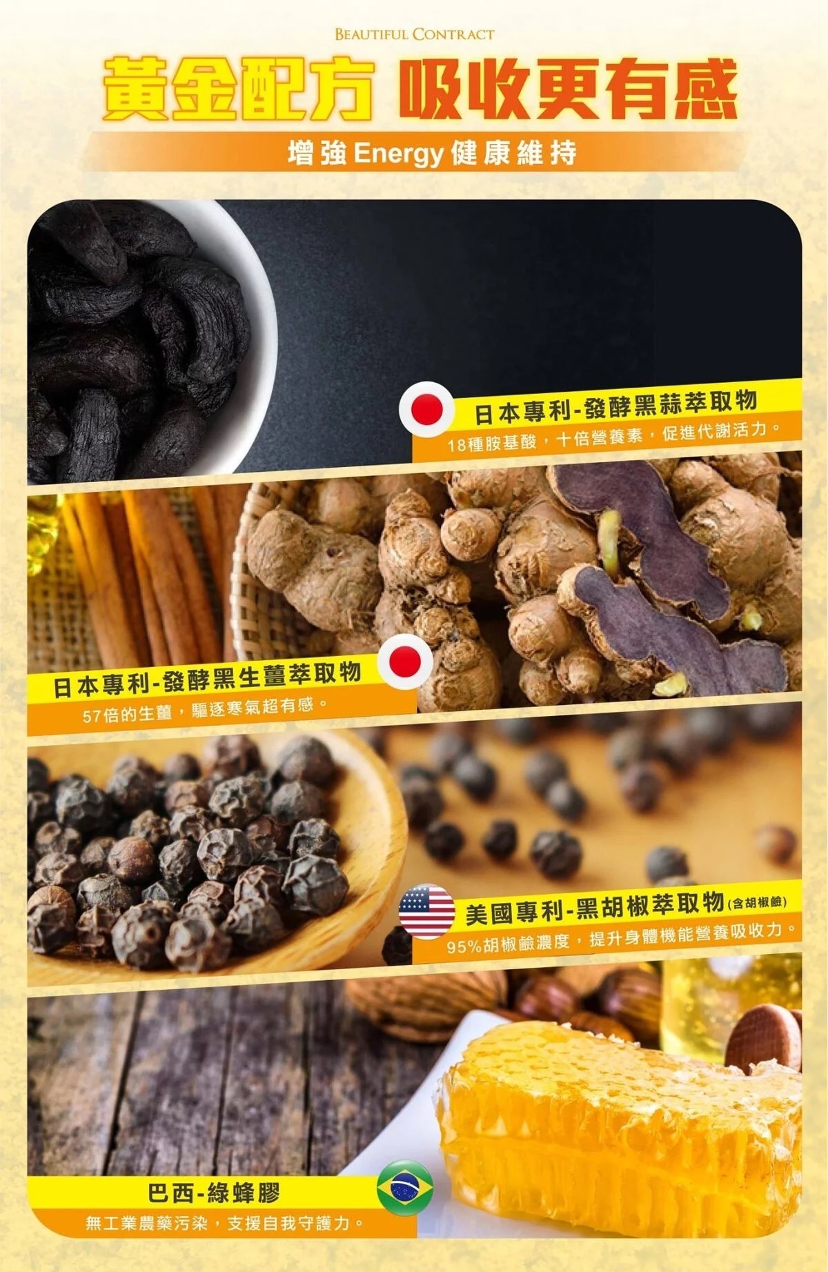 成分:日本專利發酵黑蒜萃取物、專利薑黃萃取物、巴西蜂膠(巴西蜂膠液、麥芽糊精)、美國專利芽孢乳酸菌、日本專利發酵黑生薑粉、專利黑胡椒萃取物 (含胡椒鹼)、硬脂酸鎂、甜菊萃取物。