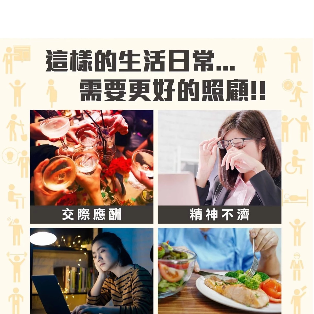 注意事項:未滿12歲以上的孩童及懷孕期不建議使用,使用期間對成分過敏及不適應者不建議食用,慢性疾病及特殊疾病患者,請經由醫師同意後食用。