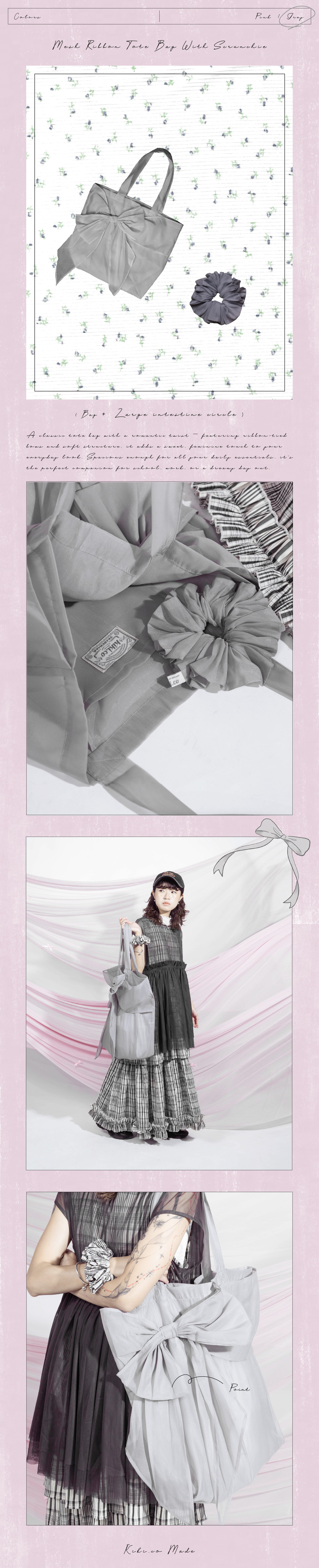 【 Kiki.co made 】 Mesh Ribbon Tote Bag With Scrunchie - Grey
