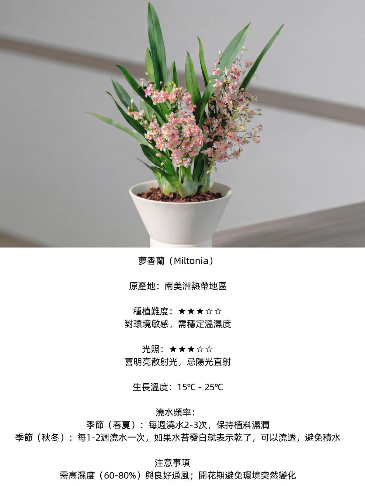 需高濕度(60-80%)與良好通風;開花期避免環境突然變化