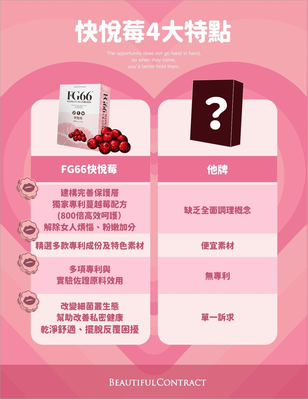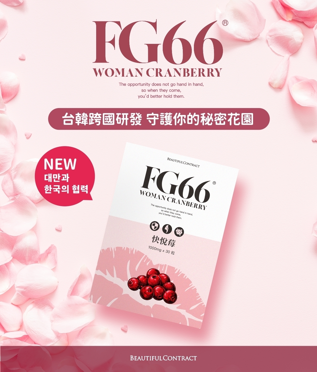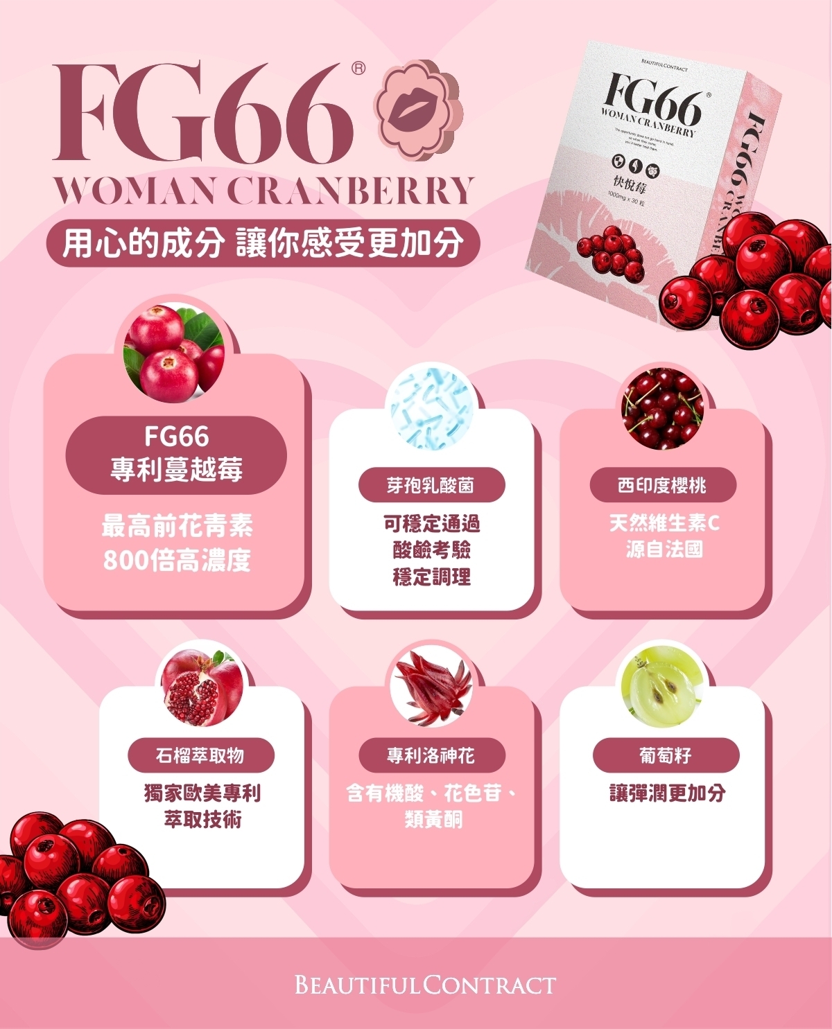 FG66 快悅苺結合特殊保養配方, 6項專利原料、24項專利認證,平衡PH值,同時滋養私密讓私密緊緻動人, 建構完善私密防護層。